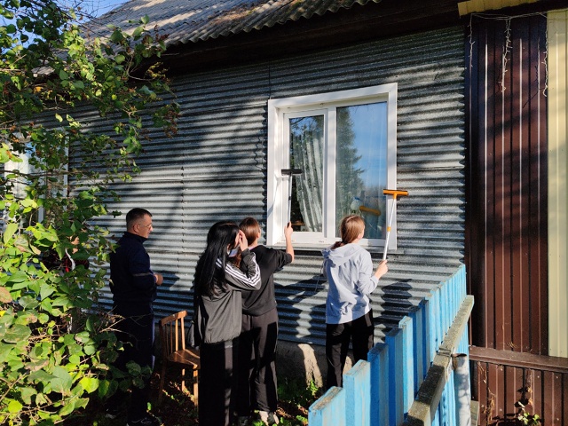 Ребята отправились по домам пожилых жителей и инвалидов своего села, чтобы помочь им с мытьем окон. Помимо чистоты в домах, юные помощники принесли с собой тепло и поздравления с наступающим праздником.