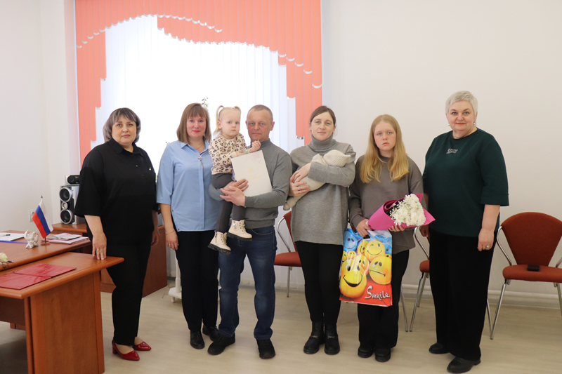 Традиционно специалист отдела ЗАГС Наталья Агафонова вручила свидетельство о рождении и поздравила счастливых родителей с рождением сыночка.