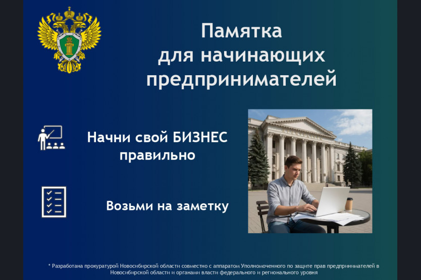 «Памятка для начинающих предпринимателей» составлена прокуратурой региона во взаимодействии с аппаратом Уполномоченного по защите прав предпринимателей в Новосибирской области и органами государственной власти по итогам встречи прокурора Новосибирской области со студентами вузов на базе НГУЭУ.