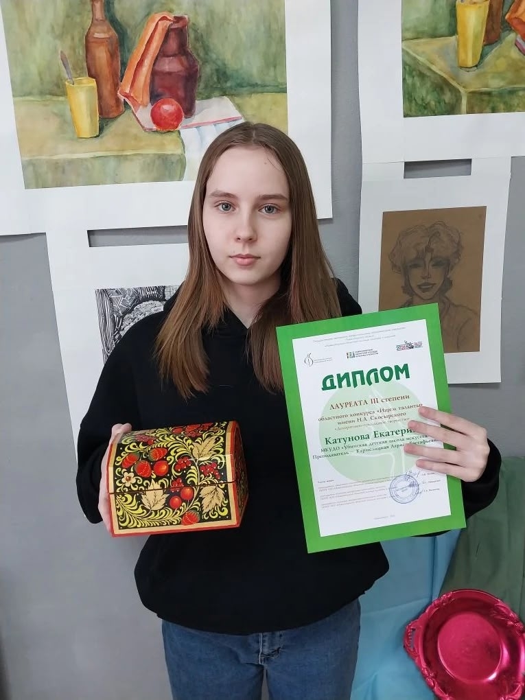 Екатерина Катунова, воспитанница Убинской детской школы искусств, стала лауреатом III степени на областном конкурсе «Ищем таланты» имени Н. А. Скосырского в номинации «Декоративно-прикладное творчество».