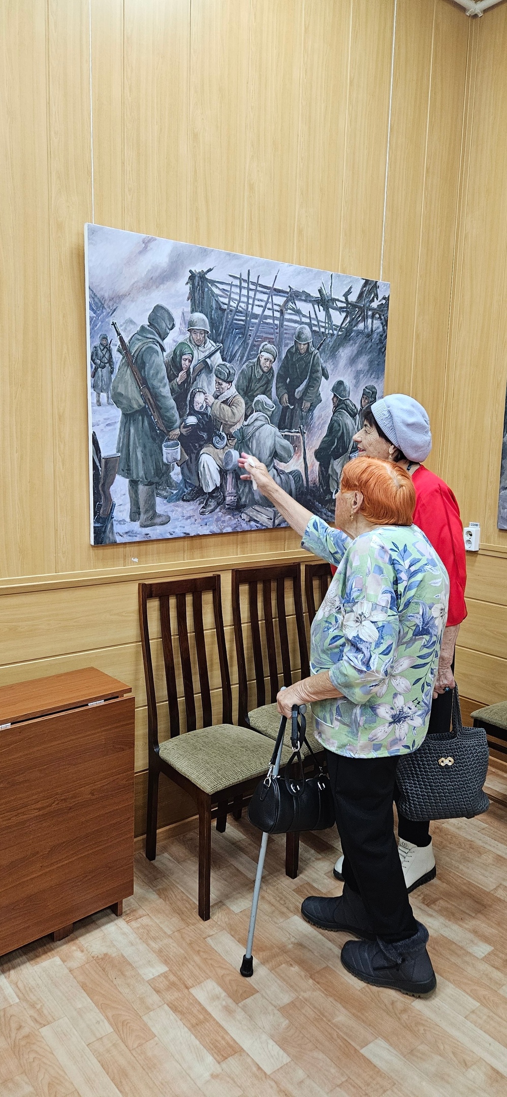 На выставке представлены полотна, показывающие разные грани Великой Отечественной войны: сцены тяжелых кровопролитных боев, героизм солдат, боль утрат боевых товарищей, фронтовой быт, редкие минуты радости, триумф победы и мирная жизнь после с грустью в сердце. Вениамин Карпович прошел войну, и то, что видел, испытал, он, благодаря своему таланту, отразил в многочисленных картинах. Они ярко воссоздают то ужасное для страны время.